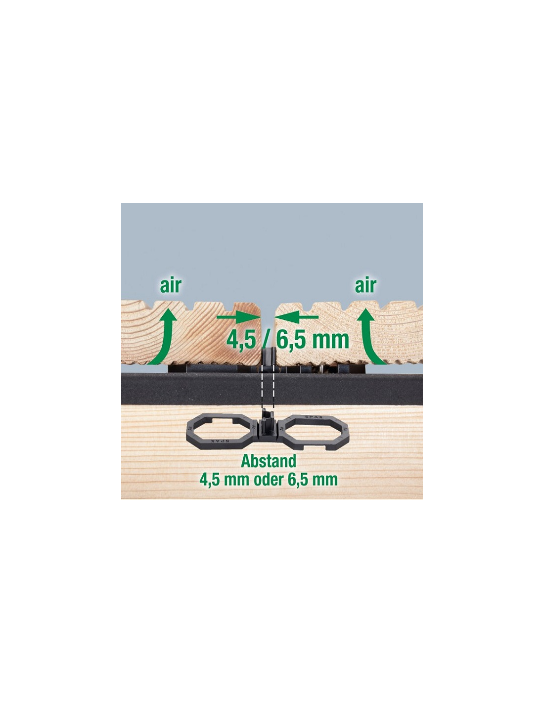 Distanční vložky pod terasová prkna SPAX AIR 4,5 mm zajišťují: