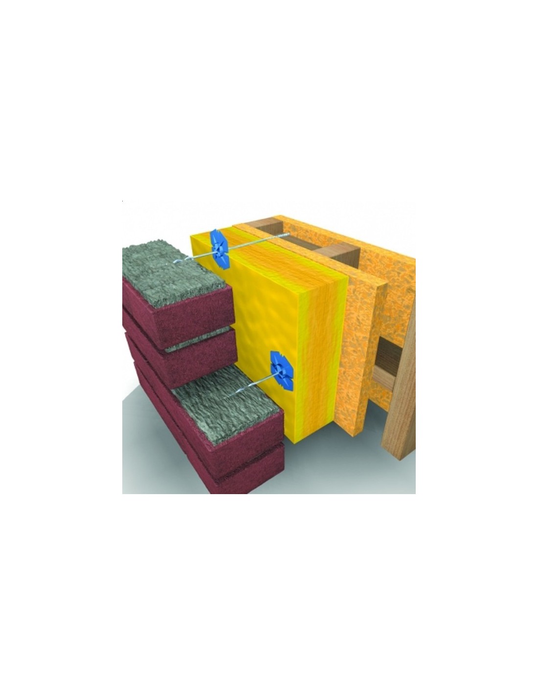 Příklad pro kotvu KWK-4/260 , za předpokladu 4 cm větrací mezery (mezi tepelnou izolací a fasádní stěnou), 2 cm kotvení do dřeva, 5 cm zapuštění do cihel, maximální tloušťka izolace pro tuto délku kotvy je 15 cm .