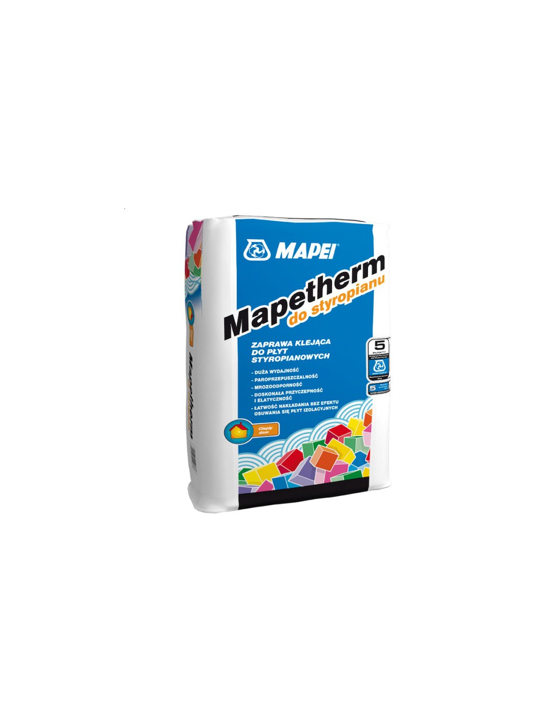 Mapetherm na polystyren je určen pro montáž polystyrenových tepelně izolačních desek na obvodové stěny. Díky svým tixotropním vlastnostem ji lze aplikovat na svislé plochy bez efektu klouzání tepelně izolačních desek. Má dobrou přilnavost ke všem materiálům běžně používaným ve stavebnictví, a proto jej lze aplikovat na cementové omítky nebo malty, beton, beton a pórobetonové tvárnice, na povrchy ze surových cihel. Mapetherm pro pěnový polystyren je šedá prášková malta složená z cementu, jemného kameniva, syntetických pryskyřic a speciálních modifikačních přísad, vyvinutá v laboratoři Mapei.